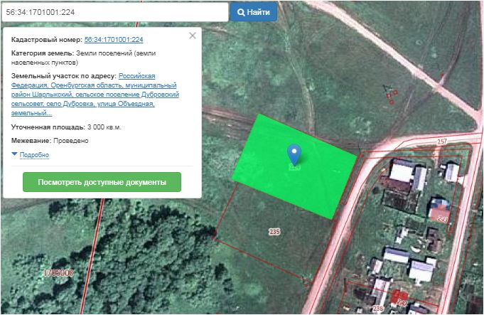 Земельный участок, кадастровый номер: 56:34:1701001:224; назначение объекта недвижимости: данные отсутствуют; виды разрешенного использования объекта недвижимости: Земли населенных пунктов, земельные участки, предназначенные для размещения домов индивидуальной жилой застройки; с целью предоставления: для размещения объектов индивидуального жилищного строительства; адрес: Оренбургская область, Шарлыкский район, село Дубровка, земельный участок расположен в северо-западной части кадастрового квартала 56:34:1701001; площадь: 3 000 кв. м.; вид права, доля в праве: собственность (совместно нажитое имущество); дата государственной регистрации: 21.10.2013 г.; ограничение прав и обременение объекта недвижимости: не зарегистрированы: основание государственной регистрации: Договор купли-продажи земельного участка от 05.09.2013 г.