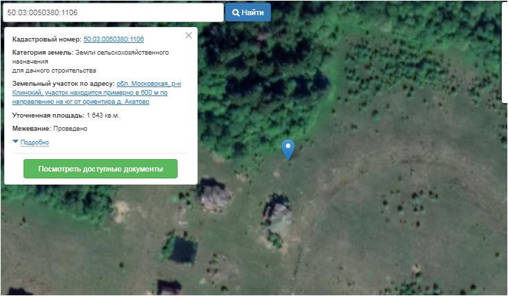 Земельный участок, назначение объекта недвижимости : для дачного строительства; кадастровый номер 50:03:0050380:1106, адрес: Московская обл., Клинский район, с/пос Нудольское, участок находится примерно в 600 м по направлению на юг от ориентира д.Акатово, площадь 1643 кв.м