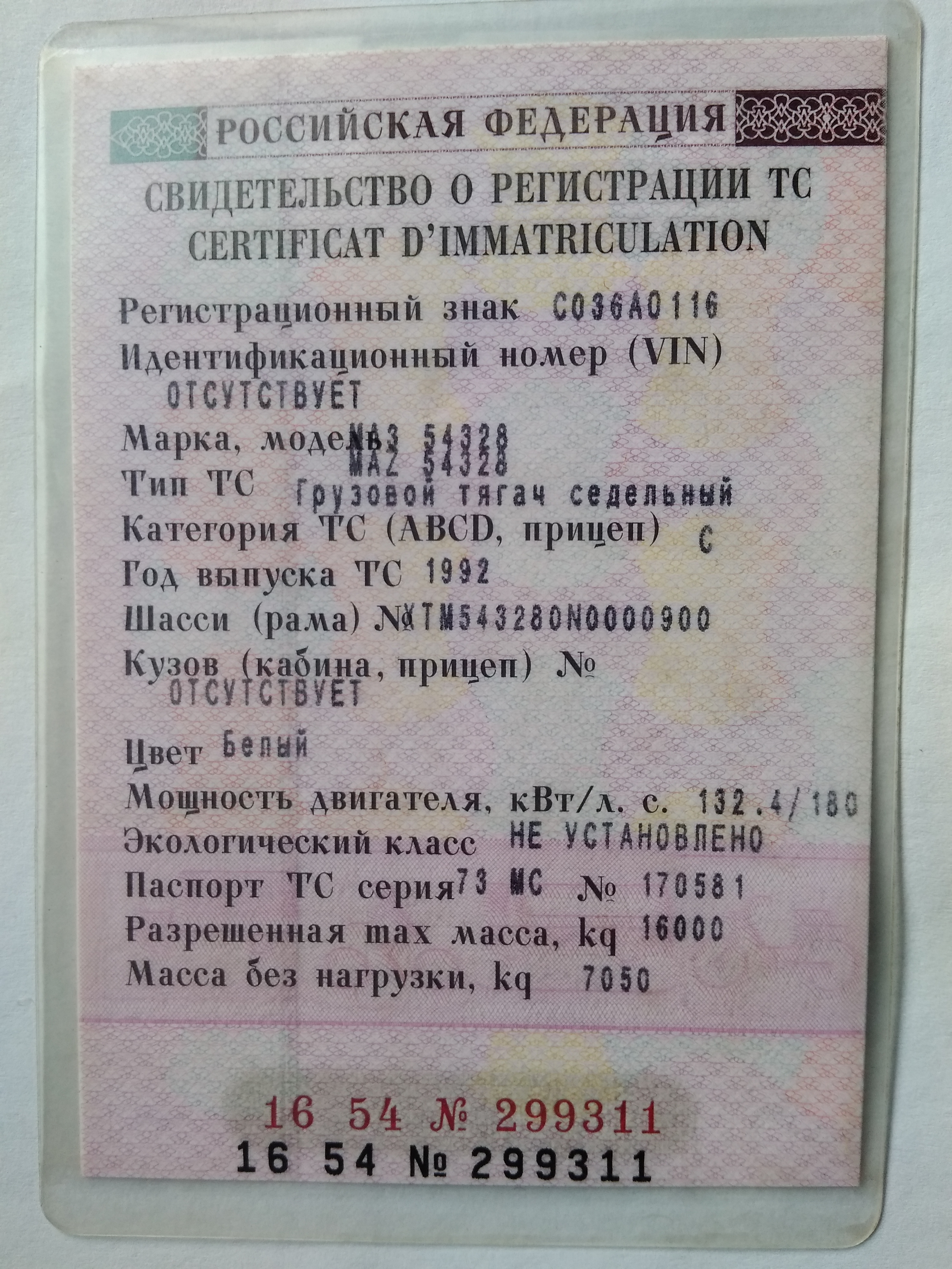 Грузовой тягач седельный, идентификационный номер VIN: отсутствует; марка, модель ТС: МАЗ 54328; Гос. Номер: С036АО116; наименование ТС: Грузовой; категория ТС: С; год изготовления ТС: 1992; модель, номер двигателя: 19849 (была произведена замена, в ПТС изменения не внесены); шасси (рама) №: XTM543280N0000900 (№ рамы подвержен коррозии, нечитаем); кузов № отсутствует; цвет кузова: белый; мощность двигателя, л.с. (кВт): 180 (132,4); рабочий объем двигателя, куб. см: 10 850; (ПТС 73 МС 170581 от 26.02.2010 утерян), авто не на ходу, неисправен ДВС