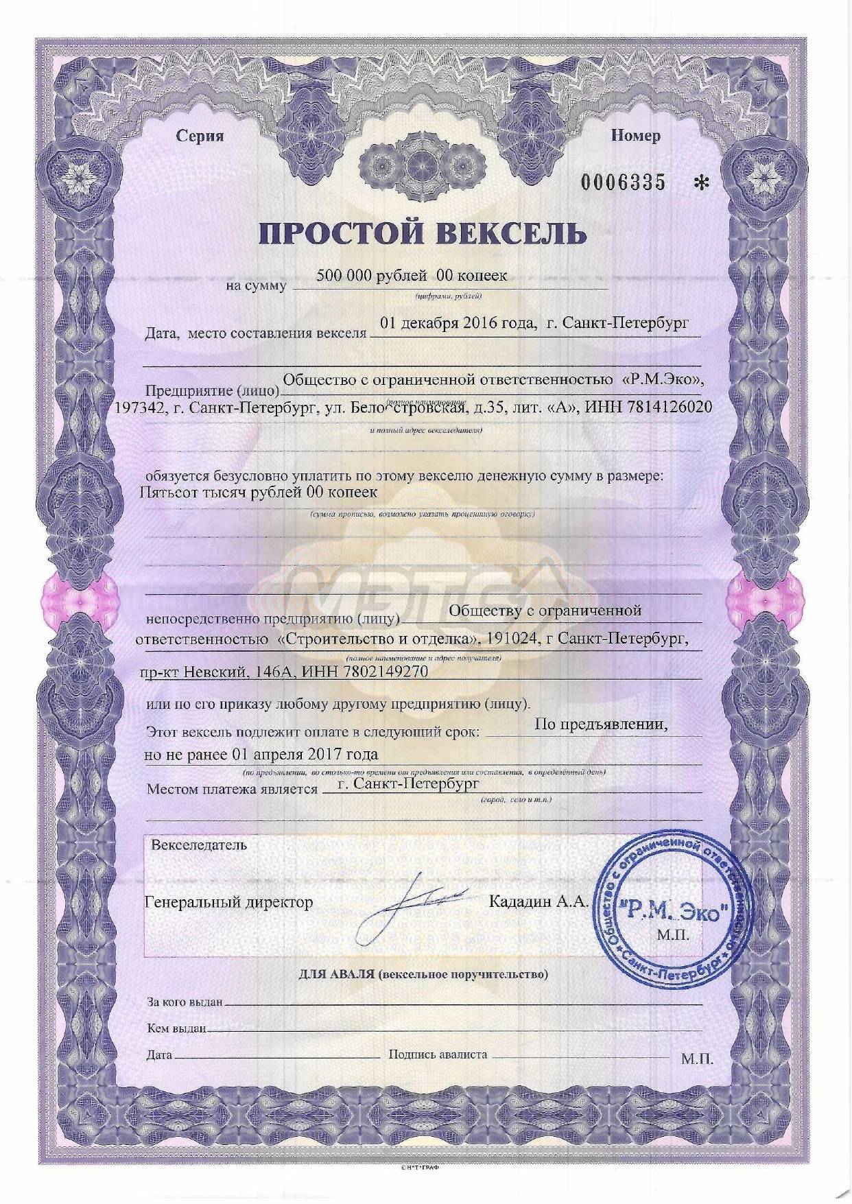 Простой вексель № 0006335 на сумму 500 000 руб., дата, место составления векселя: 01.12.2016 г., срок оплаты: по предъявлении, но не ранее 01.04.2017 г.