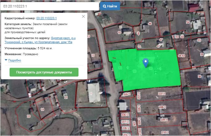 Земельный участок, кадастровый номер 03:20:110223:1, вид разрешенного использования: для производственных целей, адрес (местоположение) установлено относительно ориентира, расположенного в границах участка. Почтовый адрес ориентира: Бурятия респ., р-н Тункинский, с. Кырен, ул. Кооперативная, д.15а, площадь 5524 кв.м.