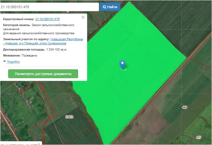 Земельный участок, кадастровый номер: 21:18:090101:476; назначение объекта недвижимости: данные отсутствуют; виды разрешенного использования объекта недвижимости: Для ведения сельскохозяйственного производства; адрес: Местоположение установлено относительно ориентира, расположенного за пределами участка. Ориентир Школа. Участок находится примерно в 4 км, по направлению на юго-запад от ориентира. Почтовый адрес ориентира: Чувашская Республика — Чувашия, р-н Порецкий, с/пос Сыресинское; площадь: 1 034 100 кв. м.; вид права, доля в праве: Общая долевая собственность, доля в праве 1/81; дата государственной регистрации: 28.04.2011 г.; ограничение прав и обременение объекта недвижимости: Аренда.