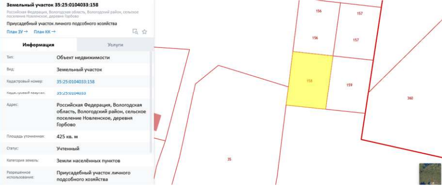 Земельный участок (вид права: собственность, местоположение: РФ, Вологодская обл., Вологодский р-н, с/п Новленское, дер. Гоброво, площадь: 425 +/-7, кад. № 35:25:0104033:158, кат. земель: земли населенных пунктов, вид разрешенного использования: приусадебный участок личного подсобного хозяйства).