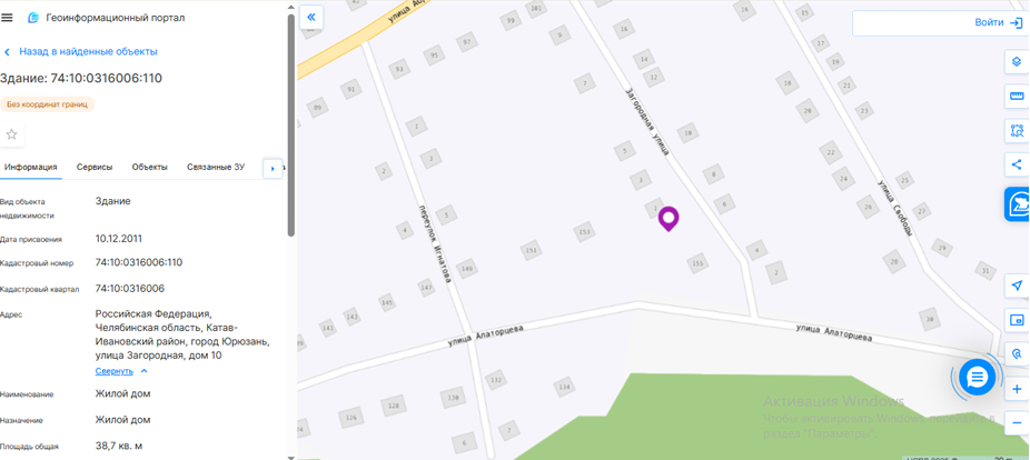 здание, земельный участок 14 доли. Здание жилое. Кадастровый номер 74:10:0316006:110. Адрес Российская Федерация, Челябинская область, Катав-Ивановский район, город Юрюзань, улица Загородная, дом 10. Площадь общая 38,7 кв. м.14 доли. Земельный участок для ведения личного подсобного хозяйства. Кадастровый номер 74:10:0316006:6. Адрес Российская Федерация, Челябинская область, Катав-Ивановский район, город Юрюзань, улица Загородная, земельный участок 10. Площадь, декларированная 1 157 кв. м