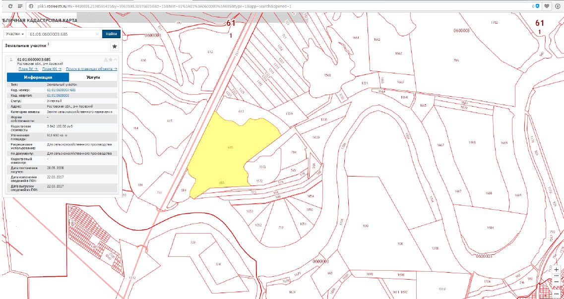 Лот №1: Земельный участок с/х назначения, кад. № 61:01:0600003:685, S-513650 кв.м.; общая долевая собственность 1/2. Адрес: Ростовская обл., Азовский район, участок находится примерно в 4700 м по направлению на юг от ориентира ПТ «Лебяжье» (в границах ОАСО «Луч»), расположенного за пределами участка.