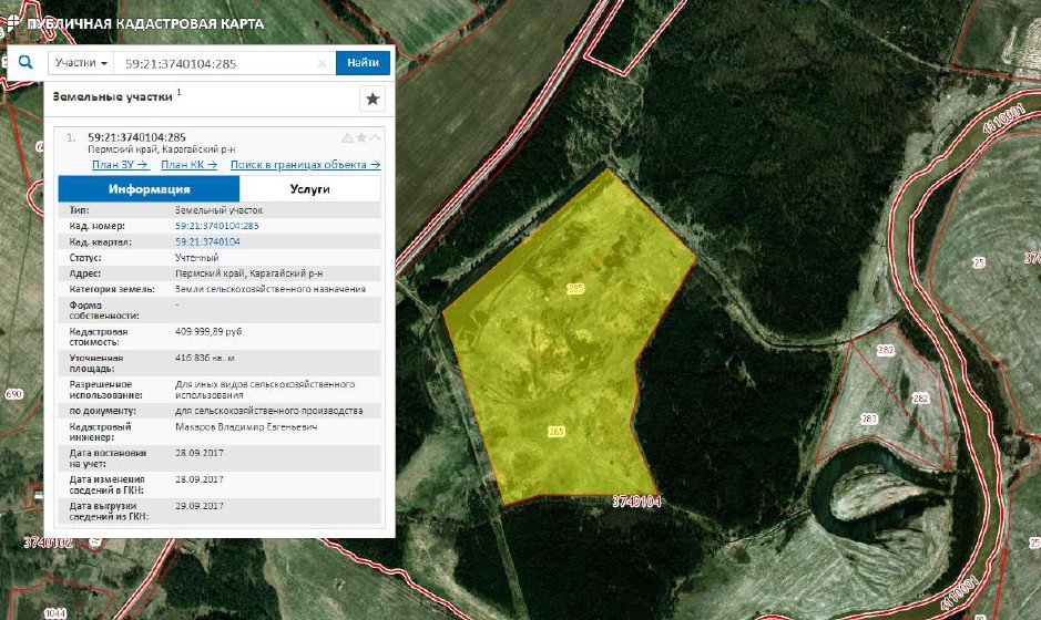 Земельный участок, по адресу Пермский край, Карагайский район, северо-восточнее д. Припадаи, кадастровый № 59:21:3740104:285, площадь – 416836 кв.м., на праве собственности. Категория земель: земли сельскохозяйственного назначения, разрешенное использование: для сельскохозяйственного производства