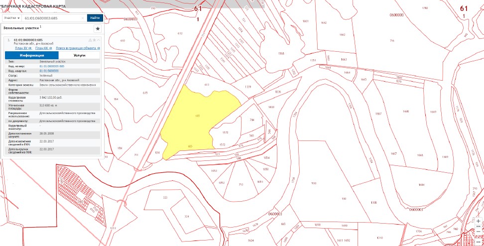 Лот №1: Земельный участок с/х назначения, кад. № 61:01:0600003:685, S-513650 кв.м.; общая долевая собственность 1/2. Адрес: Ростовская обл., Азовский район, участок находится примерно в 4700 м по направлению на юг от ориентира ПТ «Лебяжье» (в границах ОАСО «Луч»), расположенного за пределами участка.