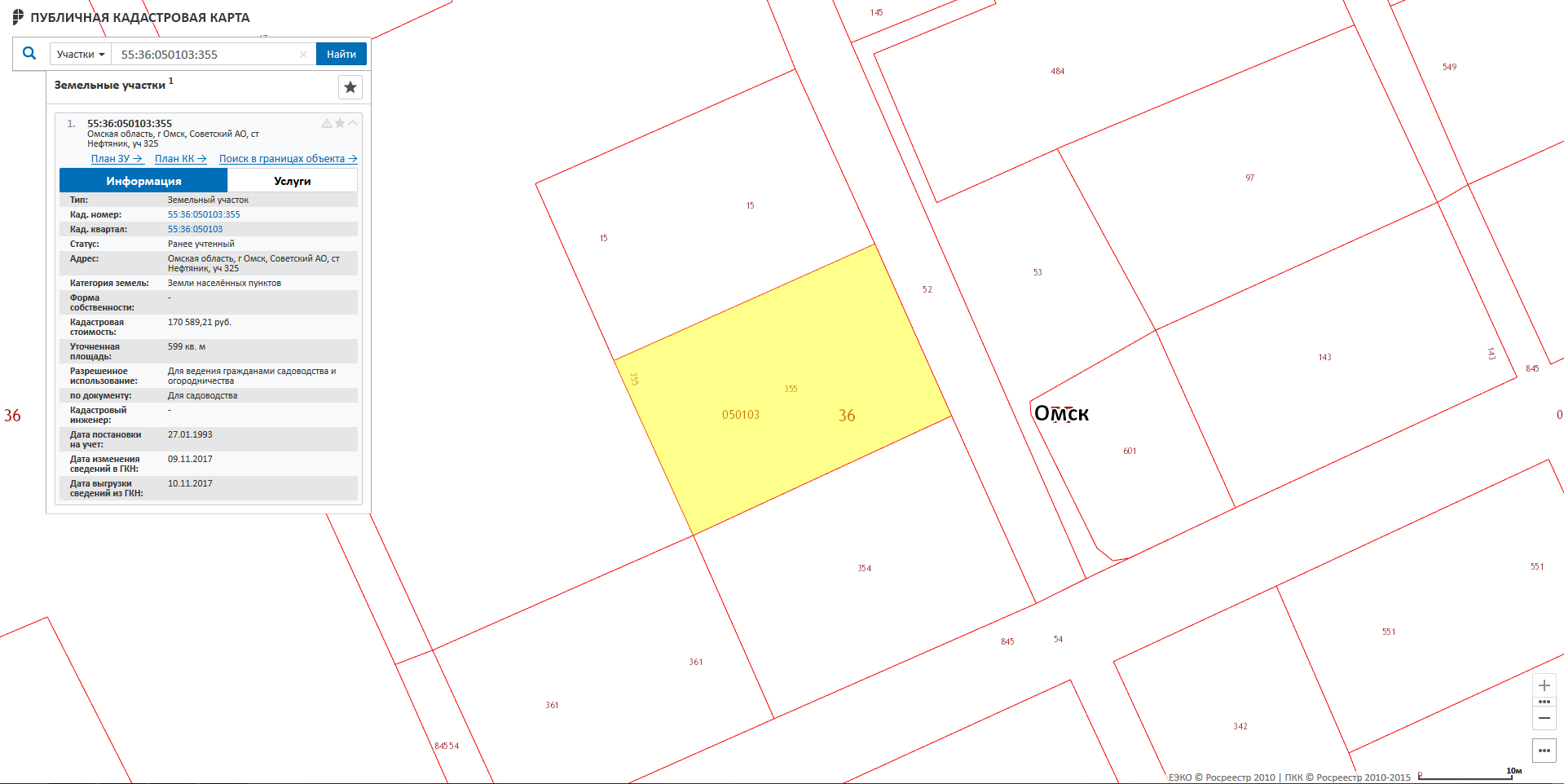 Земельный участок: назначение – земли населенных пунктов; вид разрешенного использования – садоводство, расположенный по адресу: Омская область, г. Омск, ст. «Нефтяник», участок № 325; площадь – 599 кв.м., вид права, доля в праве – общая долевая собственность 1/2. Кадастровый номер 55:36:050103:355.