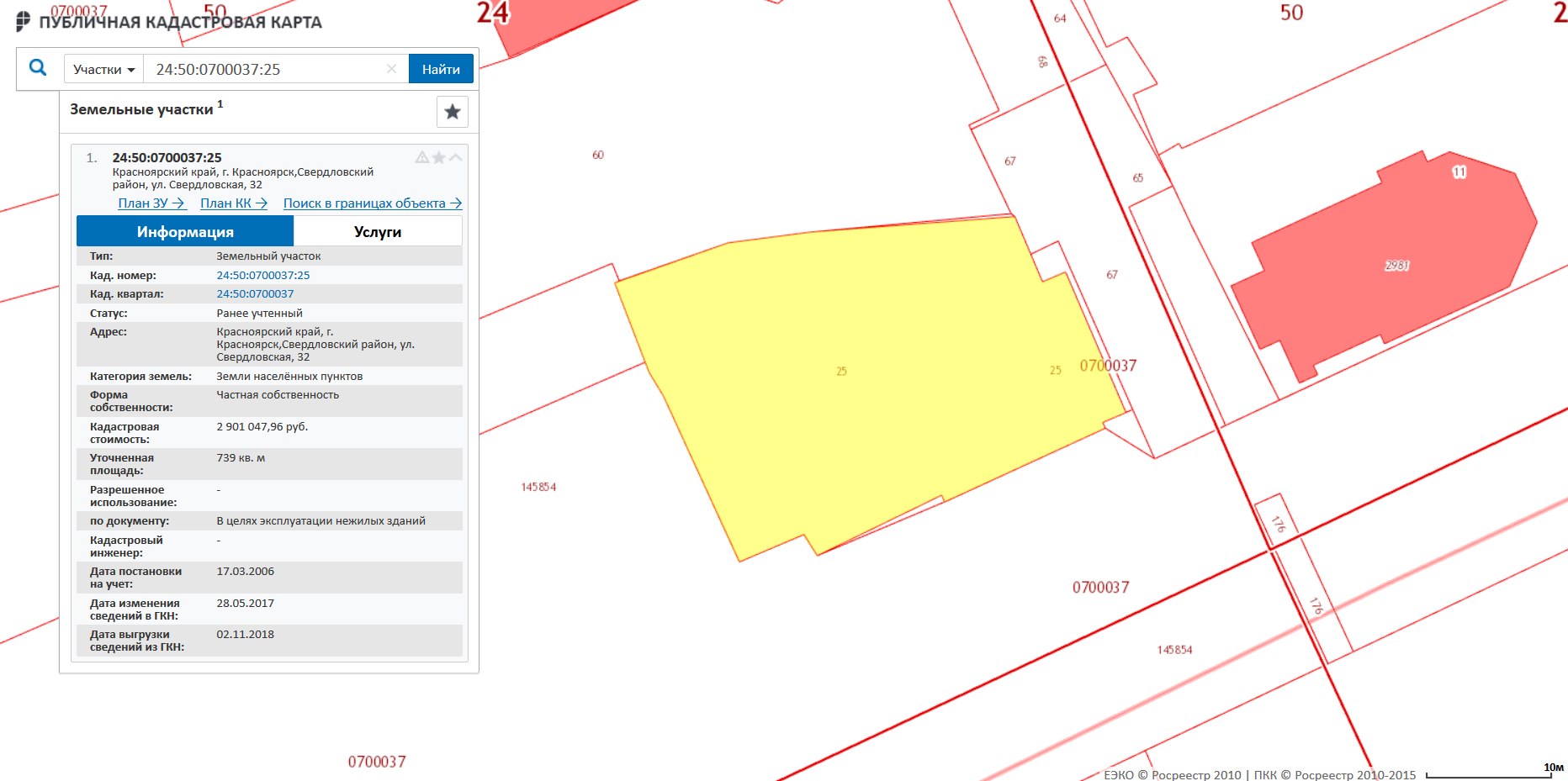 Земельный участок: вид разрешенного использования – в целях эксплуатации нежилых зданий; кадастровый номер 24:50:0700037:25, площадью 739 кв.м., местоположение относительно ориентира: г. Красноярск, ул. Свердловская, 32