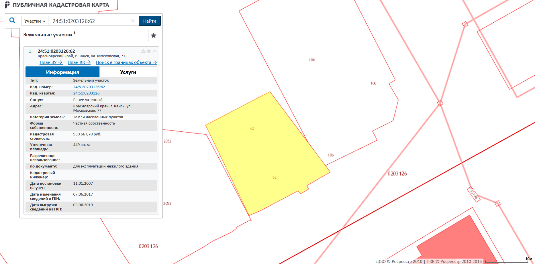 Земельный участок, категория земель: земли населенных пунктов, разрешенное использование: для эксплуатации нежилого здания, общей площадью 449 кв.м., по адресу: РФ, Красноярский край, г. Канск, ул. Московская, 77, кадастровый номер 24:51:0203126:62