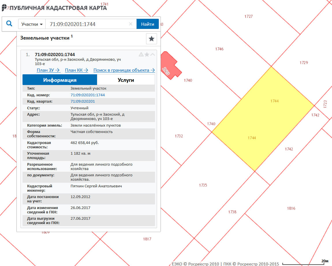 земельный участок личного подсобного хозяйства, кадастровый номер 71:09:020201:1744, площадь 1182кв.м. по адресу: Тульская обл, р-н Заокский, д. Дворяниново, уч. 103-е, номер государственной регистрации 71-71-09/020/2014-564.
