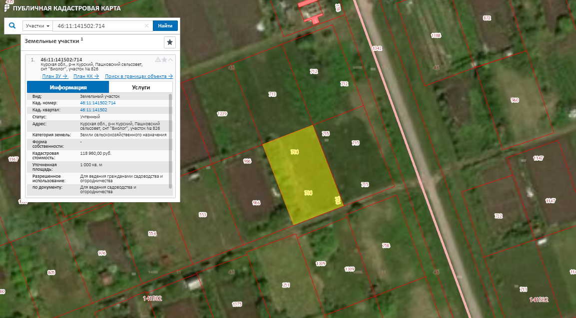 Земельный участок, земли населенных пунктов-для садоводства и огородничества, площадью 1000 кв. м., кадастровый номер 46:11:141502:714, расположенный по адресу: Курская область, Курский р-н, Пашковский сельсовет, снт «Биолог», участок №826
