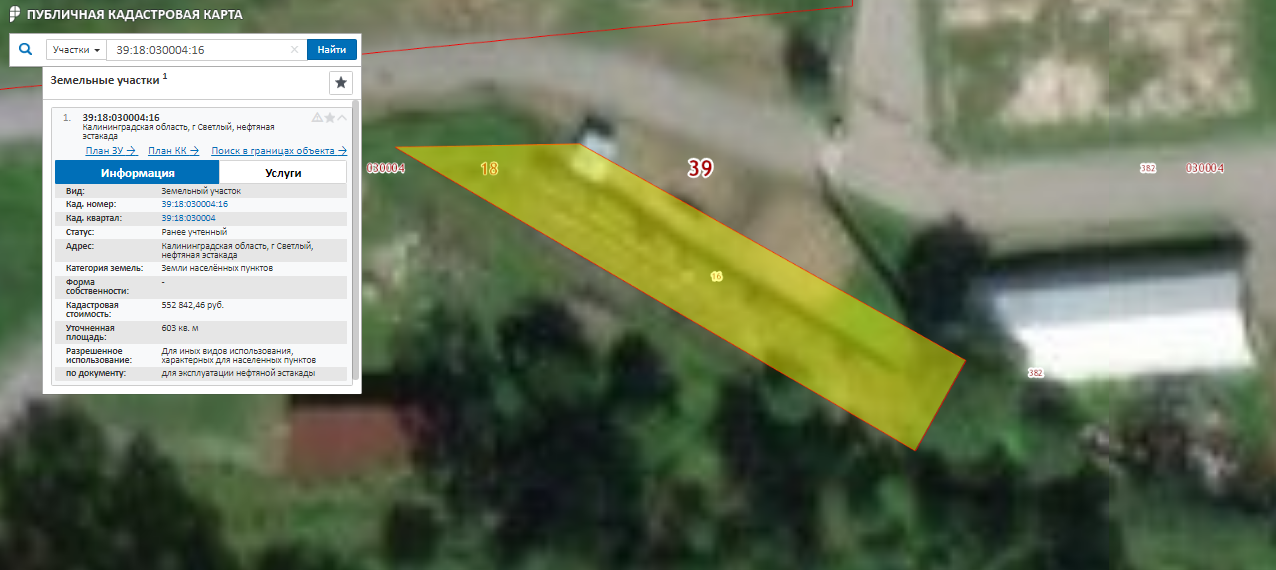 Земельный участок для эксплуатации нефтянной эстакады площадью 603, кв.м. с кадастровым № 39:18:030004:16, расположенный адресу : Калининградская обл, пос. Люблино,д,1