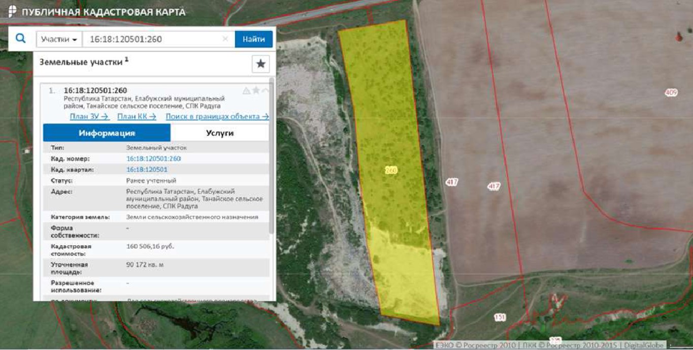 Лот №5 Право аренды до 11.04.2061 г. земельного участка, кад. №16:18:120501:260; площ. 90 172 кв. м, Земли сельскохозяйственного назначения, для сельскохозяйственного производства, Республика Татарстан, Елабужский муниципальный район, Танайское сельское поселение, СПК Радуга; Право аренды до 11.04.2062 г. земельного участка, кад.№16:18:120501:417; площ. 416 655 кв. м, Земли сельскохозяйственного назначения, для размещения объектов сельскохозяйственного назначения и сельскохозяйственных угодий, Республика Татарстан, Елабужский муниципальный район, Танайское сельское поселение.
