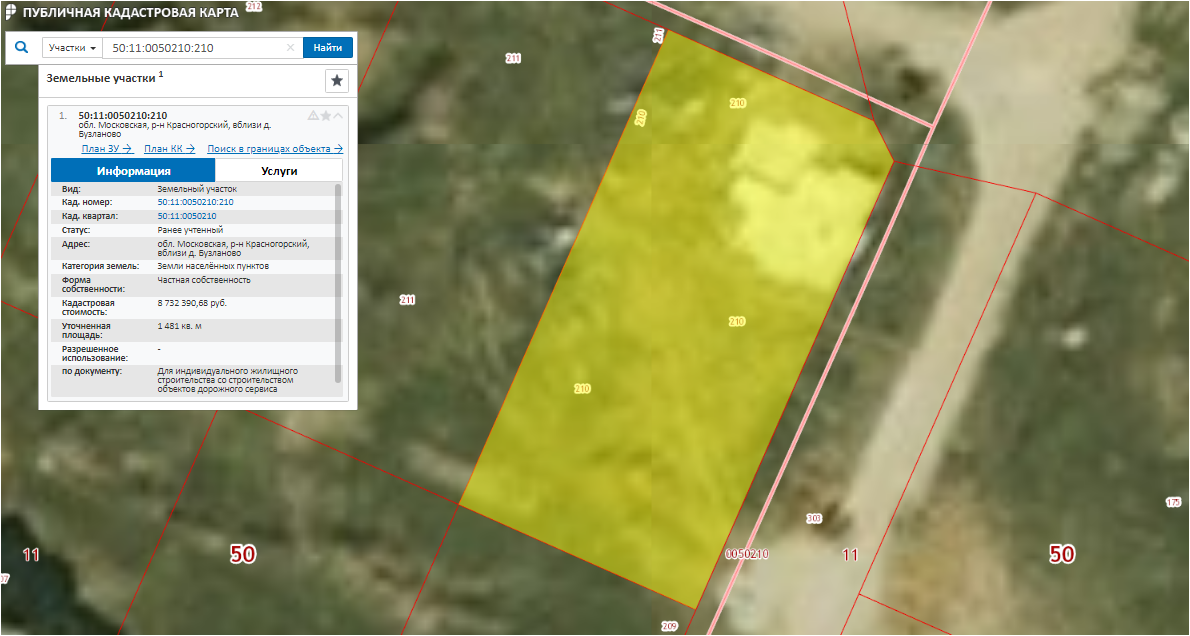 Земельный участок, категория земель: земли населенных пунктов, разрешенное использование: для индивидуальной жилой застройки, площадью 1 481,0 кв.м., адрес: Московская область, Красногорский район, вблизи дер. Бузланово кадастровый номер 50:11:0050210:210
