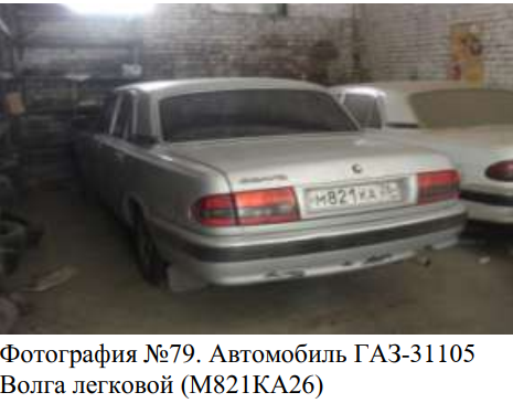 Автомобиль ГАЗ-31105 «Волга» легковой (М 821 КА 26), инв. №500036. VIN-X9631105071362469, тип ТС- легковой, марка -ГАЗ-31105, категория ТС -В, № двигателя -2,4L-DOHC*227610614, шасси - отсутствует, кузов- 31105070138905, мощность- 137, рабочий объем-2429, завод изготовитель ООО ГАЗ (Россия), год выпуска – 2006, гос. номер М821КА26. Техническое состояние оценивается как «условно пригодное». ПТС 52-МК-823476.
