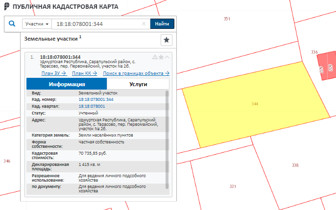 Земельный участок. Земли населённых пунктов. Для ведения личного подсобного хозяйства. Общая площадь: 1415 кв.м, кадастровый номер: 18:18:078001:344, адрес: Удмуртская республика, Сарапульский район, с. Тарасово, пер. Первомайский, участок № 2 б. Доля в праве ½.