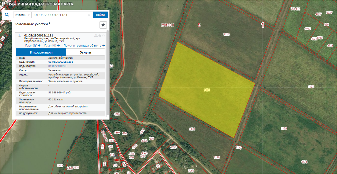 Земельный участок расположен по адресу: Российская Федерация, Респ. Адыгея, Тахтамукайский р-н, бывший с/з Адыгейский секция №1 Ук, секция №1к, №1р, №11р об.пл. 60 131 кв.м., кадастровый № 01:05:2900013:1131, категория земель: земли населенных пунктов – для жилищного строительства.