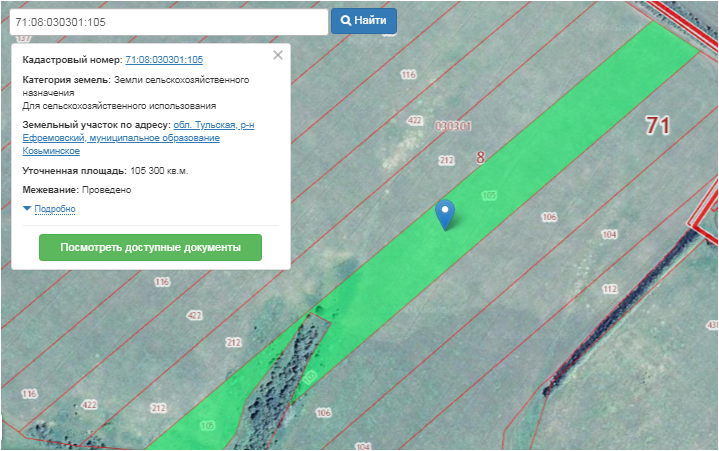 Земельный участок, категория земель: для сельскохозяйственного использования, кадастровый номер: 71:08:030301:105, вид права: общая долевая собственность, доля в праве 1/2, общая площадь: 105 300 кв.м, адрес объекта: Тульская область, Ефремовский район, МО Козьминское.