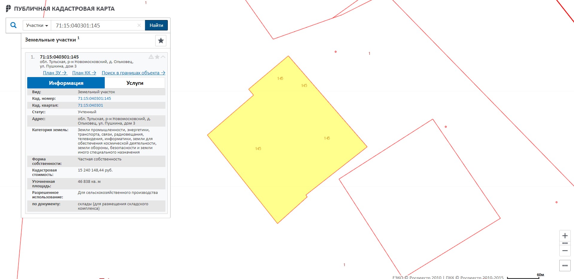 Земельный участок, на котором находится закладываемый объект недвижимости, категория земель: земли промышленности, энергетики, транспорта, связи, радиовещания, телевидения, информатики, земли для обеспечения космической деятельности, земли обороны, безопасности и земли иного специального назначения, склады (для размещения складского комплекса) общей площадью 46 838 (Сорок шесть тысяч восемьсот тридцать восемь) кв.м Тульская область, Новомосковский район, дер. Ольховец, ул.Пушкина, д.3, кадастровый (или условный) номер: 71:15:040301:145