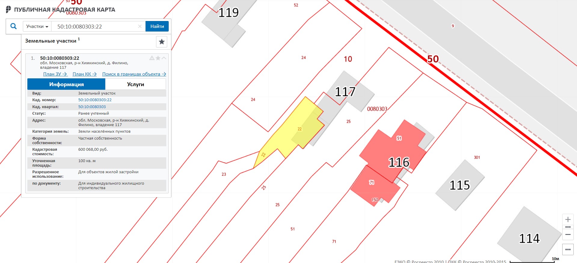 Земельный участок площадью 100 кв.м. по адресу: Московская область, Химкинский р-н, д. Филино, вл. 117, кадастровый номер: 50:10:0080303:22, для индивидуального жилищного строительства; Земельный участок площадью 616 кв.м. по адресу: Московская область, Химкинский р-н, д. Филино, вл. 117, кадастровый номер: 50:10:0080303:23, для индивидуального жилищного строительства
