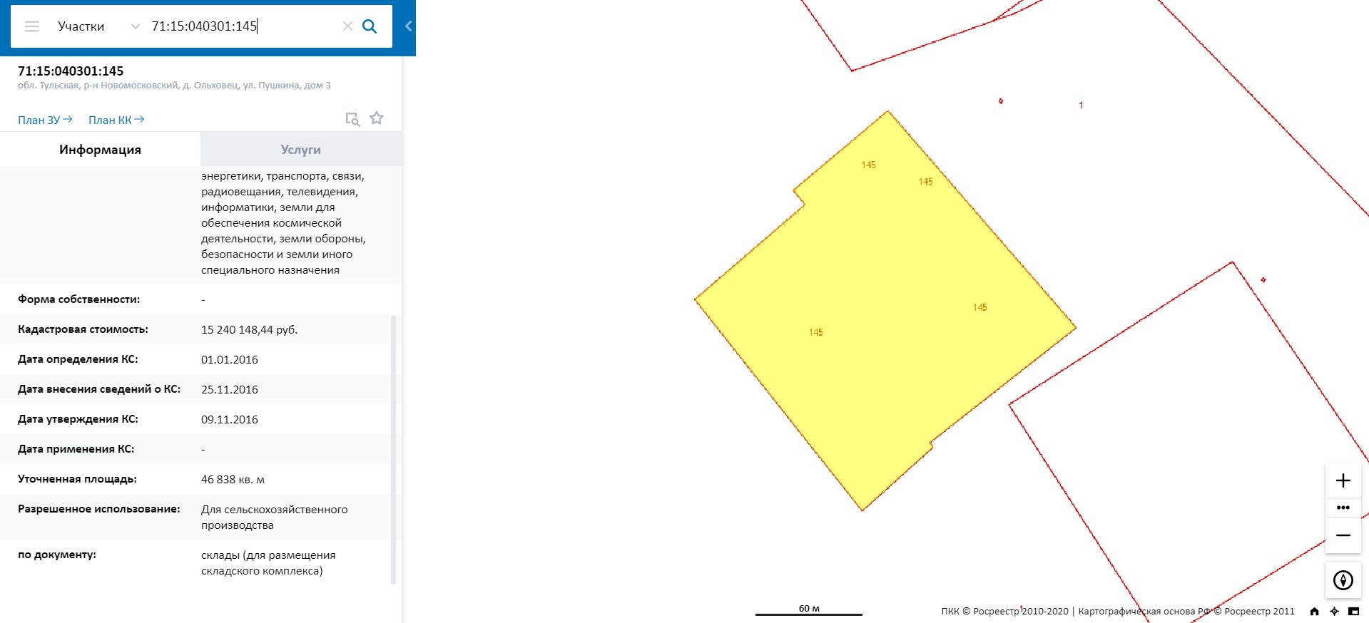 Земельный участок, категория земель: земли промышленности, энергетики, транспорта, связи, радиовещания, телевидения, информатики, земли для обеспечения космической деятельности, земли обороны, безопасности и земли иного специального назначения, склады (для размещения складского комплекса) общей площадью 46 838 (Сорок шесть тысяч восемьсот тридцать восемь) кв.м Тульская область, Новомосковский район, дер. Ольховец, ул.Пушкина, д.3, кадастровый (или условный) номер: 71:15:040301:145