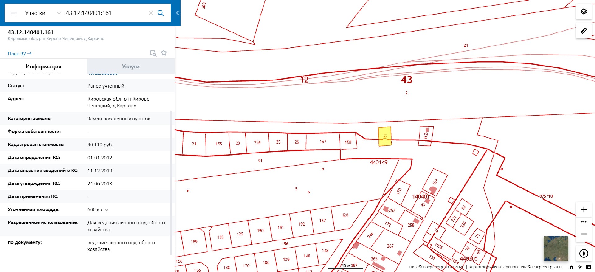 Земельный участок, кадастровый №43:12:140401:161, адрес: Кировская область, Кирово-Чепецкий район, д. Каркино, общая площадь 600 кв.м. Ограничение прав на земельный участок, предусмотренное статьей 56 Земельного кодекса Российской Федерации; ограничение в границах зоны устанавливается в соответствии с Правилами охраны электрических сетей напряжением 1000В, утвержденных Постановлением Совета Министров СССР от 26.03.1984 No255, охранная зона объекта электросетевого хозяйства –воздушной линии электропередачи –ВЛ-220 кВ «Вятка-Бумкомбинат», зона с особыми условиями использования территории 43.12.2.26 Постановление от 26.03.1984 №255 «Об утверждении правил охраны электрических сетей напряжением свыше 1000В».