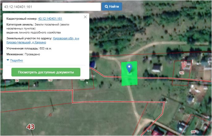 Земельный участок, кадастровый №43:12:140401:161, адрес: Кировская область, Кирово-Чепецкий район, д. Каркино, общая площадь 600 кв.м. Ограничение прав на земельный участок, предусмотренное статьей 56 Земельного кодекса Российской Федерации; ограничение в границах зоны устанавливается в соответствии с Правилами охраны электрических сетей напряжением 1000В, утвержденных Постановлением Совета Министров СССР от 26.03.1984 No255, охранная зона объекта электросетевого хозяйства –воздушной линии электропередачи –ВЛ-220 кВ «Вятка-Бумкомбинат», зона с особыми условиями использования территории 43.12.2.26 Постановление от 26.03.1984 №255 «Об утверждении правил охраны электрических сетей напряжением свыше 1000В».