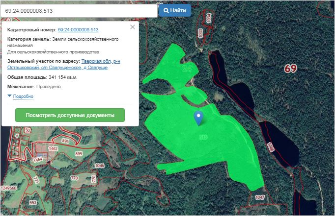 Земельный участок 341154 кв.м. Кадастровый номер: 69:24:0000008:513. Местоположение установлено относительно ориентира, расположенного в границах участка. Почтовый адрес ориентира: Тверская об л, р-н Осташковский, сп Свапущенское, д Свапуще.