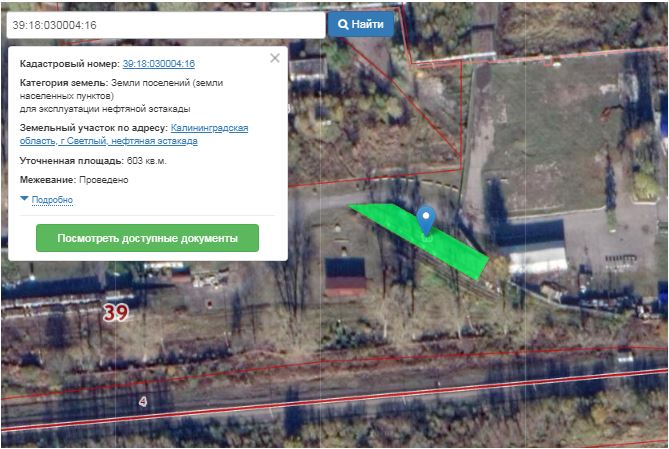 Земельный участок для эксплуатации нефтянной эстакады площадью 603, кв.м. с кадастровым № 39:18:030004:16, расположенный адресу : Калининградская обл, пос. Люблино,д,1